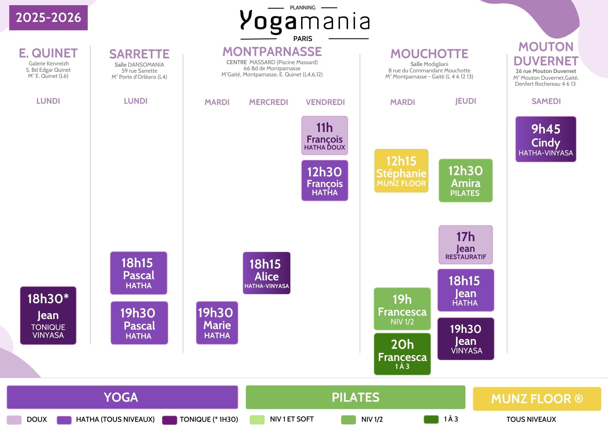 - MARDI : Yoga doux à 16h et Pilates à 12h30, à 17h40 (niv1), 18h45 (niv 1/2) et 19h50 (progressif)